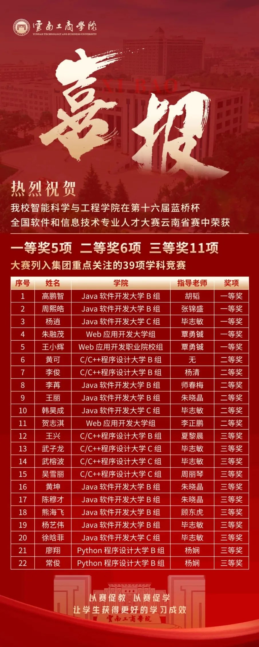近日,云南工商学院在第十六届蓝桥杯全国软件和信息技术专业人才大赛省赛中,荣获省级一等奖5项、二等奖6项、三等奖11项。