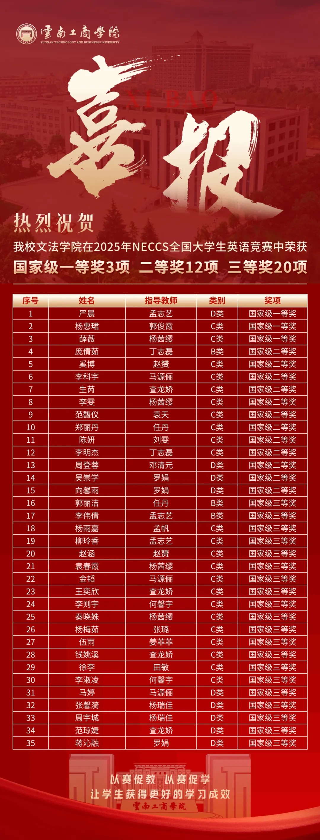 近日,云南工商学院在2025年NECCS全国大学生英语竞赛中,斩获35项国家级荣誉。其中,国家级一等奖3项、二等奖12项、三等奖20项,D类排名云南省同类院校第一,创下学校在该赛事中获奖历史新高。