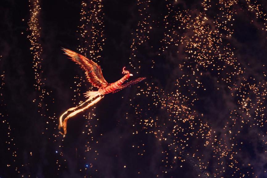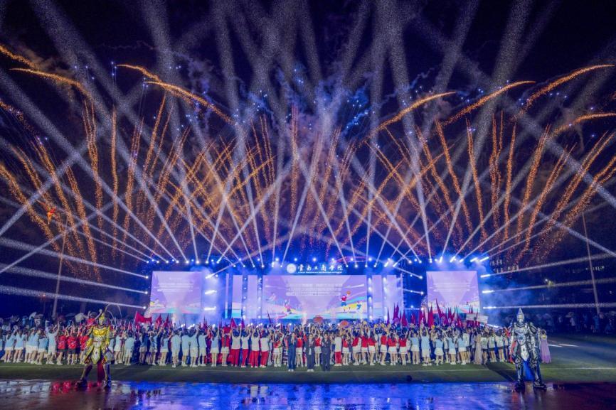 这场属于青春与拼搏的盛会正式开启,刹那间,寓意吉祥与腾飞的“龙凤呈祥”飞天表演直冲云霄,震撼寰宇的烟花秀,点燃了整个初夏的夜空!
