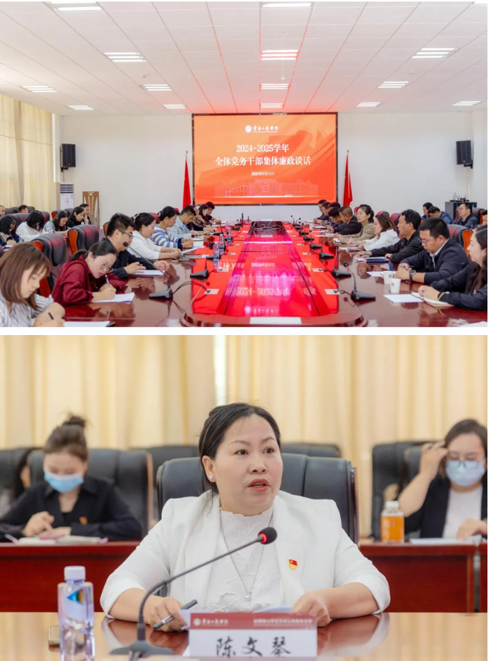 为深入贯彻落实习近平总书记关于全面从严治党的重要论述,扎实推进深入贯彻中央八项规定精神学习教育,切实加强党风廉政建设与“清廉学校”创建工作,6月11日,云南工商学院组织召开党务干部集体廉政谈话会议。校党委书记李国琼、党委副书记佘达文、纪委书记陈文琴及各二级党组织党务干部参会,会议由党委组织部副部长李敏霖主持。