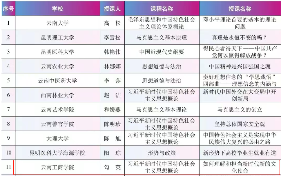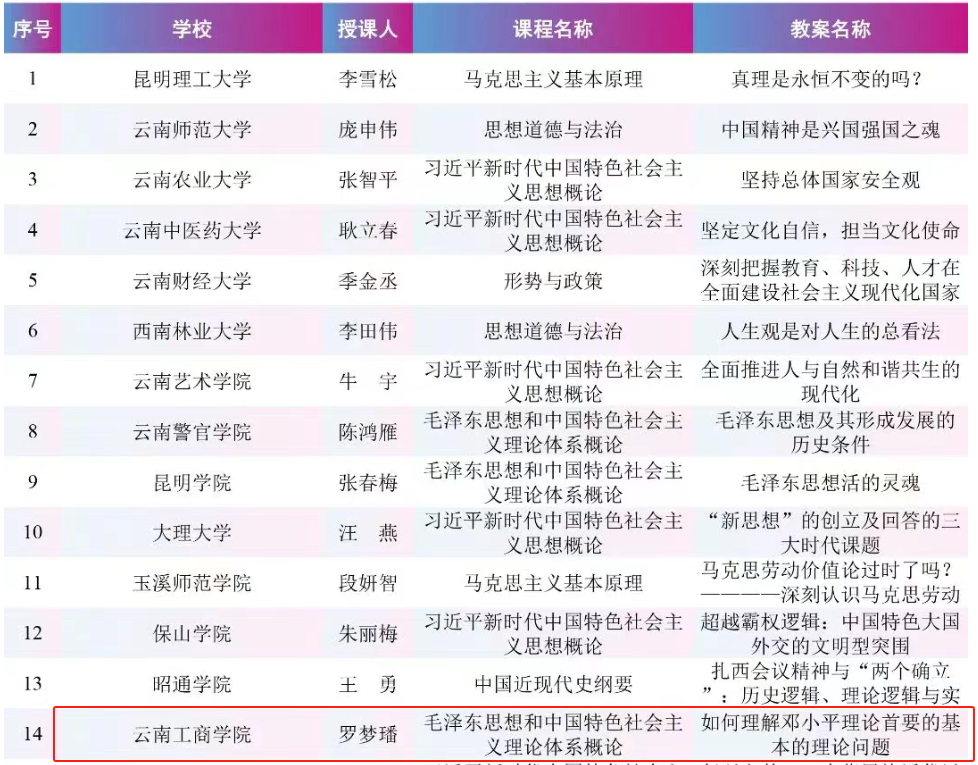 近日,由云南省委教育工委组织开展的云南省学校思政课名师工作室、精品课程、优秀教案遴选工作结果公布,云南工商学院马克思主义学院凭借卓越的教学成果与深厚的学术底蕴,在激烈的竞争中脱颖而出,精品课程与优秀教案双双成功入选。这是继2024年斩获云南省思政课教师教学竞赛一等奖3项(获奖数量全省第一)后,在思政课建设领域取得的又一重要突破,充分彰显了学校在思政教育方面的教学实力。