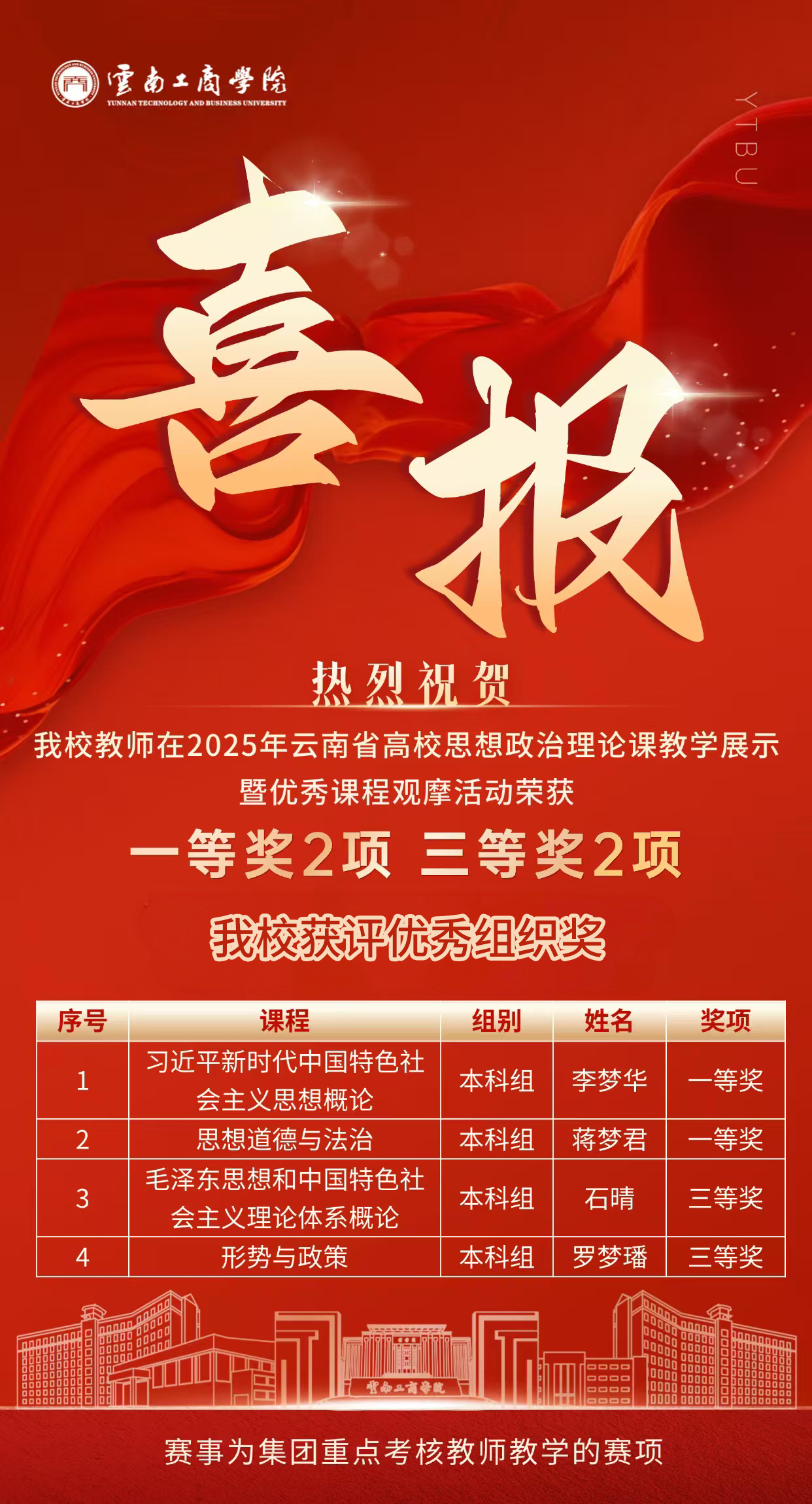 近日,云南省教育厅《关于2025年云南省高校思想政治理论课教学展示暨优秀课程观摩活动结果的公示》揭晓,云南工商学院马克思主义学院教师团队表现卓越,斩获一等奖两项,三等奖两项,并获评优秀组织奖,再一次有力印证了思政教育教学改革成效,充分彰显了学校思政教育一以贯之的高水准与强劲实力。
