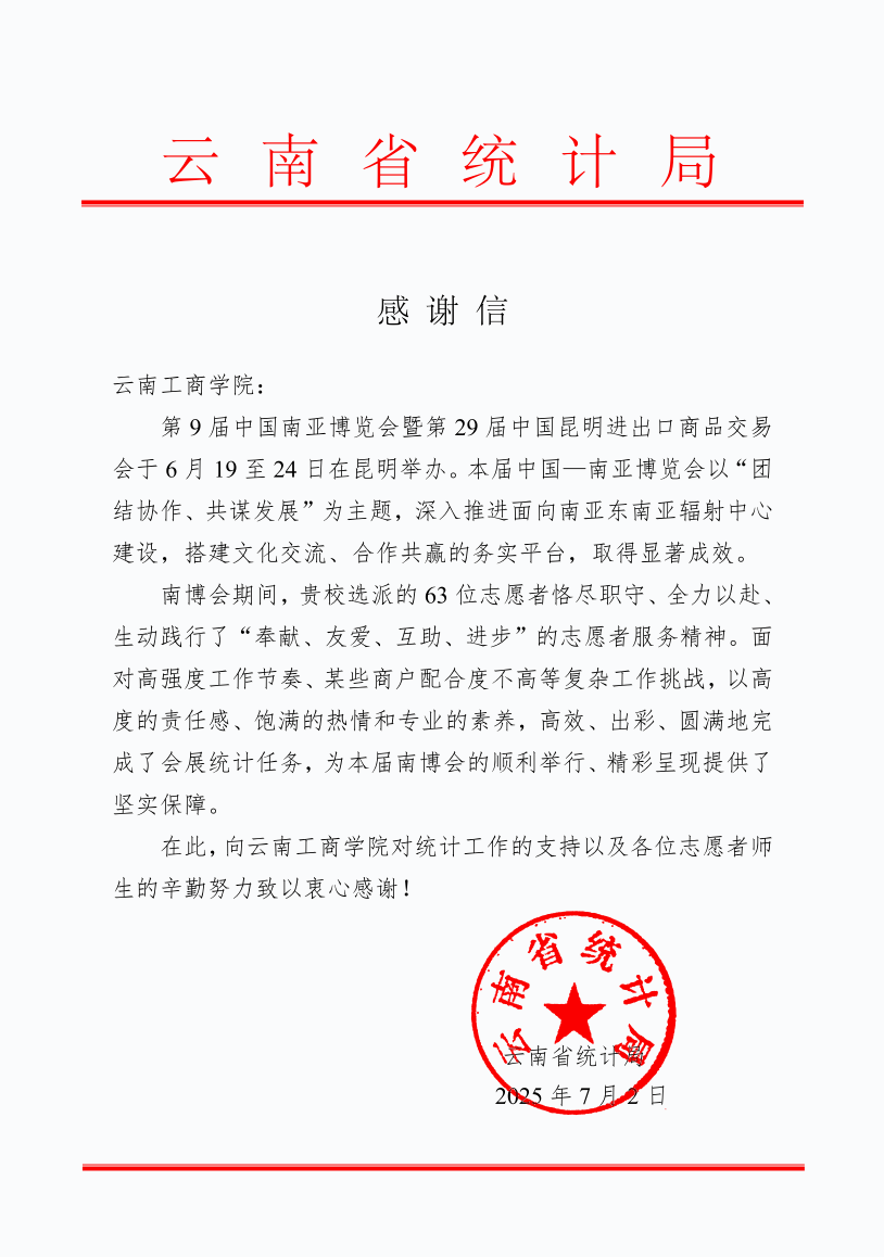 近日,云南工商学院收到云南省统计局发来的感谢信,对学校选派的“小白云”志愿者团队在第9届中国—南亚博览会暨第29届中国昆明进出口商品交易会(以下简称“南博会”)会展统计工作中的突出表现致以诚挚谢意。这封感谢信,不仅是对云工商师生专业能力与敬业精神的高度认可,更是对学校志愿服务团队责任担当与无私奉献的生动诠释。