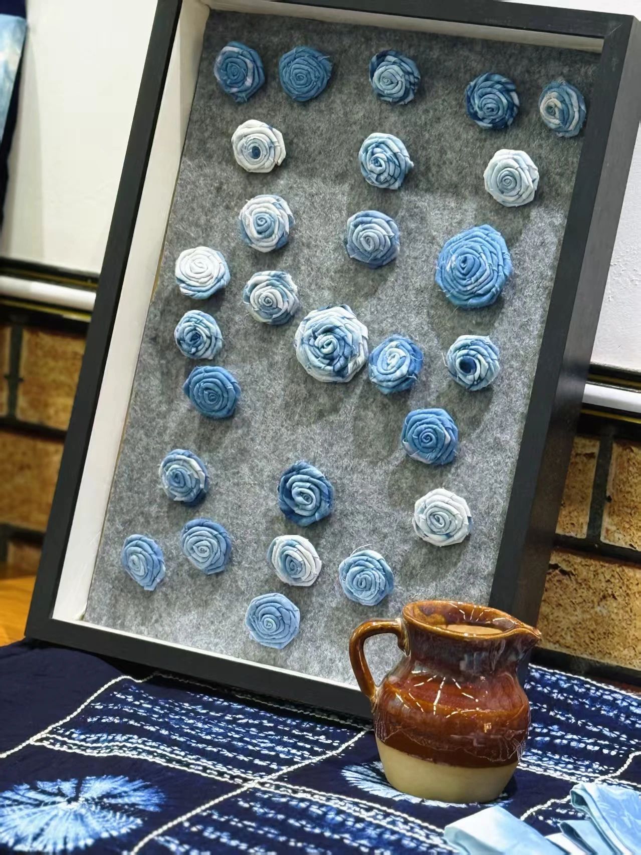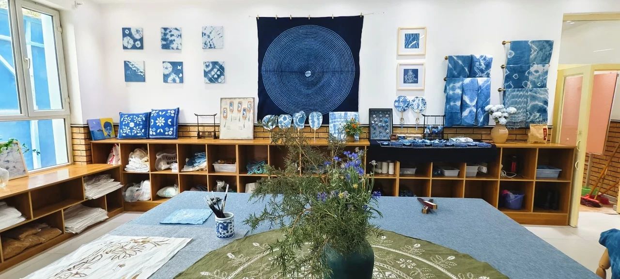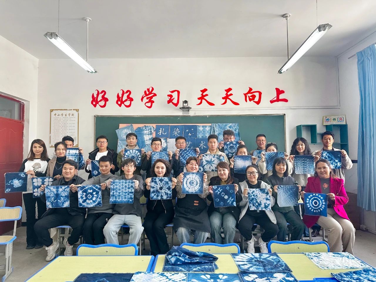在学校的支持下,他创办了扎染工作室。在一间闲置的教室,买来染料、棉布和针线,带着几个有兴趣的老师和学生慢慢摸索。首次尝试染料比例失误、扎结手法错误,布料染灰、纹样糊成一团。但他始终记得大学时老师的教诲:“设计就是在不断试错中找到答案。”