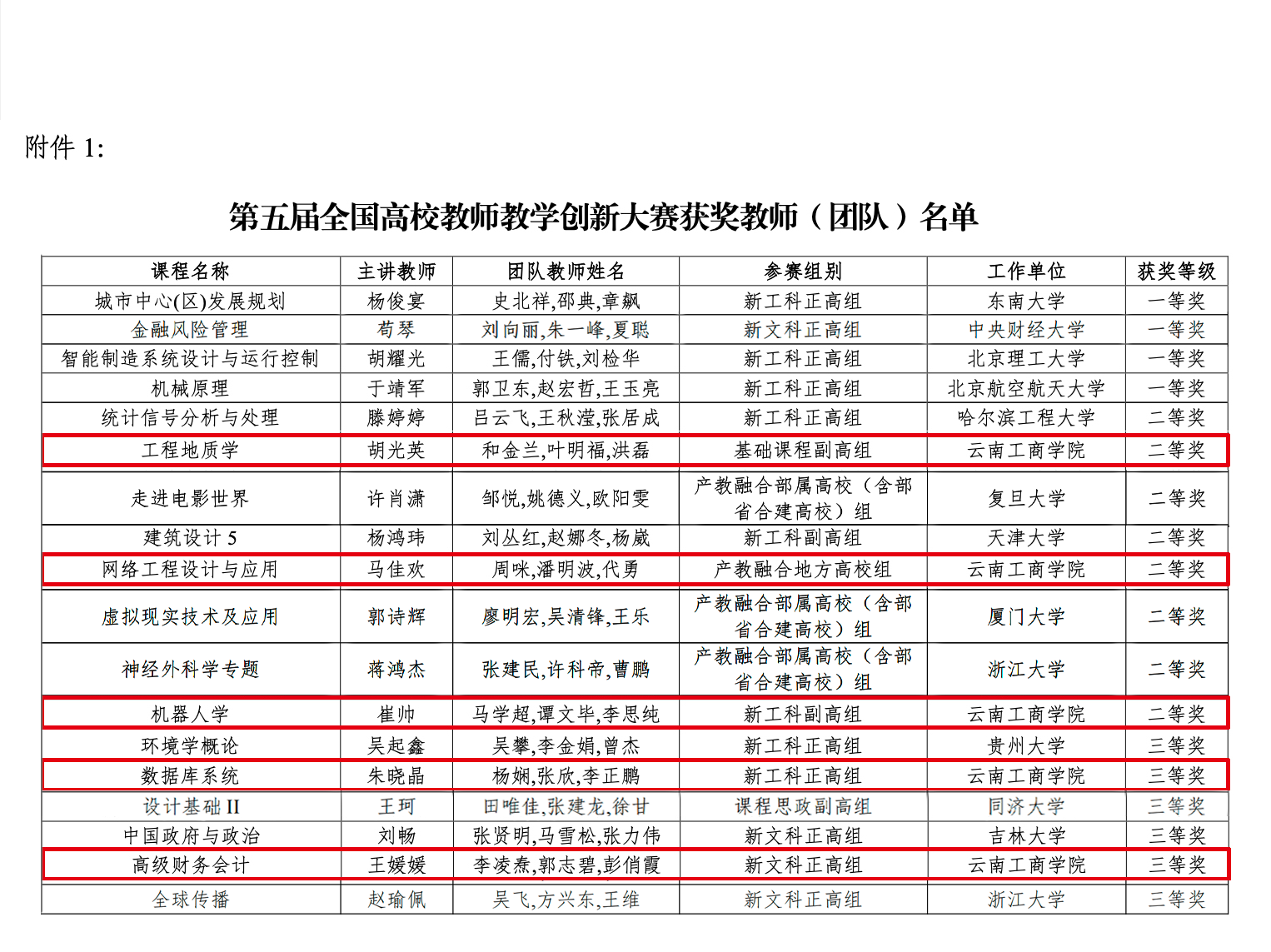 第五届全国高校教师教学创新大赛云南工商学院获奖教师