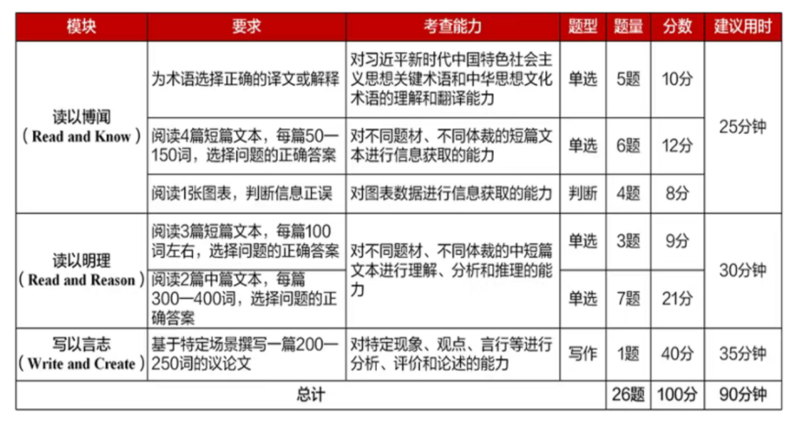 英语组题目类型、难度、测试系统均与2025“外研社·国才杯”“理解当代中国”全国大学生外语能力大赛英语组综合能力、笔译校赛要求一致,具体如下所示: