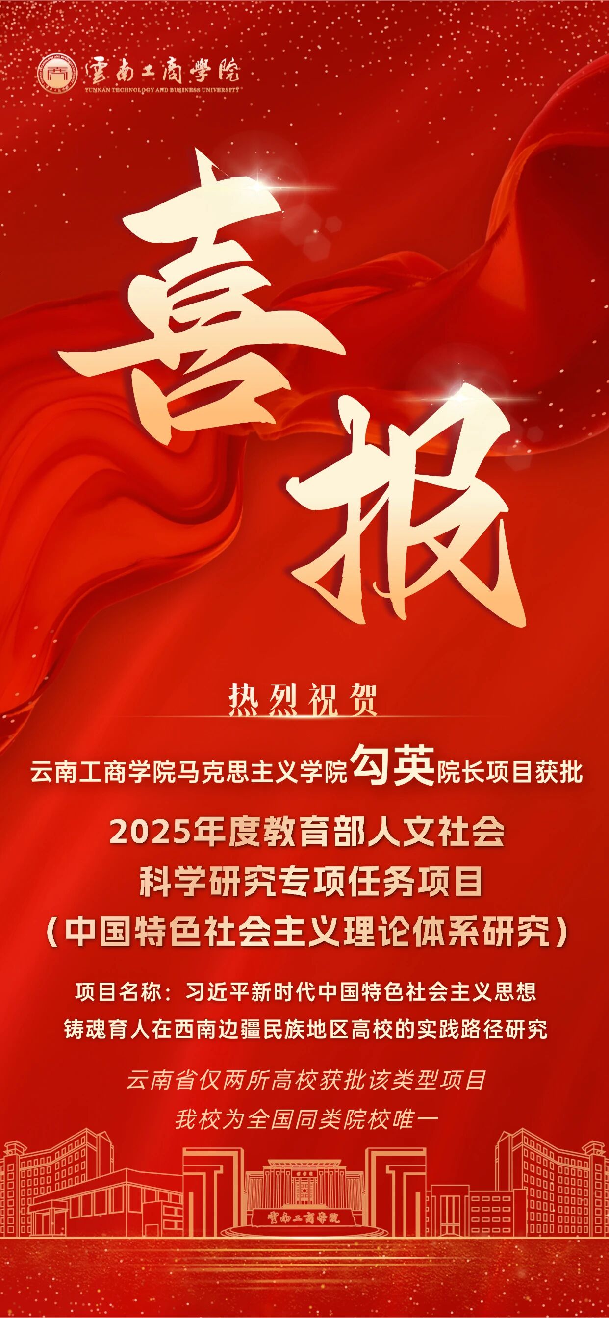 近日,2025年度教育部人文社会科学研究专项任务项目(中国特色社会主义理论体系研究)立项名单公布,云南工商学院马克思主义学院院长勾英主持申报的《习近平新时代中国特色社会主义思想铸魂育人在西南边疆民族地区高校的实践路径研究》项目从众多申报项目中脱颖而出,成功斩获立项,云南工商学院也是全国同类院校中唯一入选项目的高校。这是云南工商学院在人文社科领域科研实力持续攀升的又一重要成果。