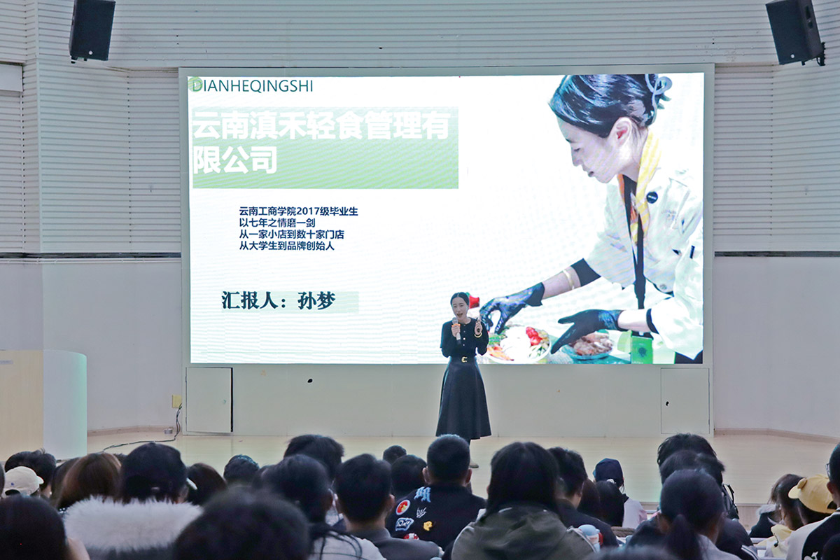 孙梦校友分享了她在大学时期萌生创业想法的契机——从校园食堂30平方米的小店出发,以健康轻食理念为核心,开启了“滇禾轻食”的第一步。她说:“那时候没想过能做多大,只是想让更多人吃到新鲜、轻盈的餐食。”