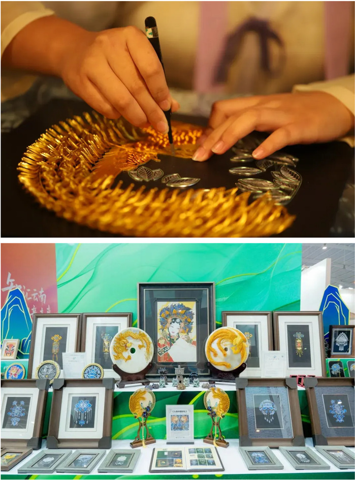 云南工商学院此次展出的翠羽银丝是谢晶教授团队研发的省级非遗技艺,深度融合了点翠、花丝、景泰蓝三大传统工艺的精髓。为破解传统工艺的原料局限,团队创新采用丝纤维制作仿真“翠羽”,以氧化铝丝替代贵金属,既坚守了传统工艺的本真内核,又践行了生态保护理念。团队依托工作室构建起产教融合的传承体系,累计培养超千名学员,同时积极赋能乡村振兴,成功实现文化价值与市场价值的有机统一。