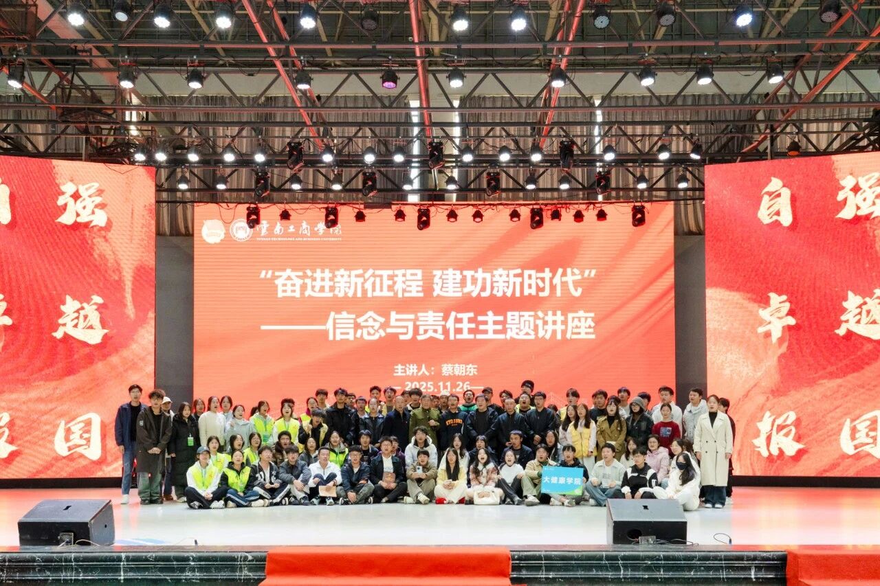 为深入学习贯彻习近平新时代中国特色社会主义思想,激励广大师生坚定理想信念、强化使命担当,以昂扬姿态投身伟大新征程,云南工商学院于2025年11月26日下午在体育馆隆重举行“奋进新征程 建功新时代”——信念与责任主题讲座。此次主题讲座特邀蔡朝东同志演讲。学校全体党务干部、各二级学院学生发展中心人员、马克思主义学院教师及学生代表共同聆听了讲座。