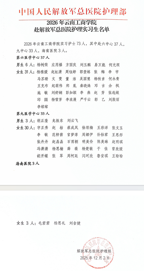 入选中国人民解放军总医院(原301医院)2026年度护理实习生名单