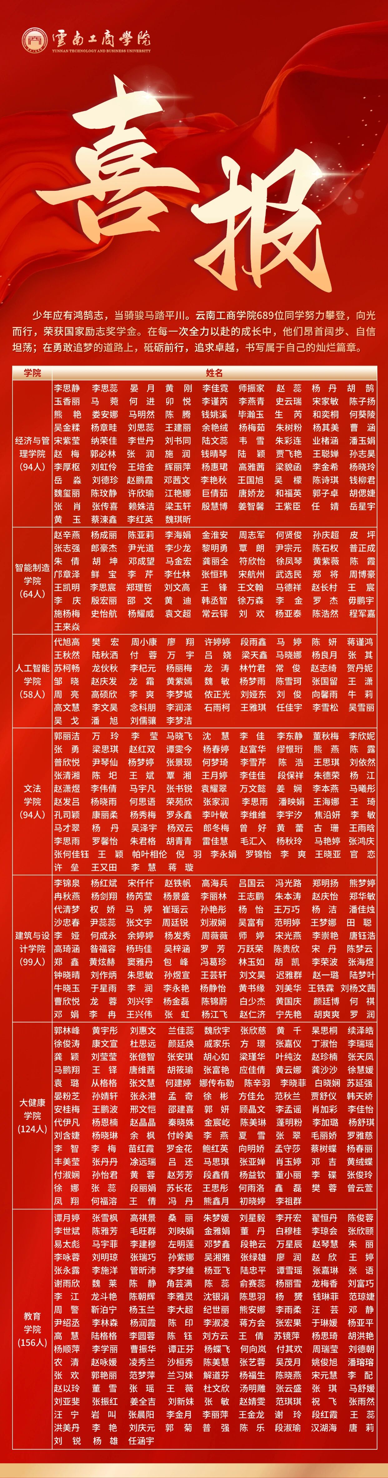 近日,2024—2025学年国家励志奖学金学生名单已完成公示。云南工商学院689名学子荣获国家励志奖学金,发放奖学金额共计4134000元。特向获奖同学表示热烈祝贺!