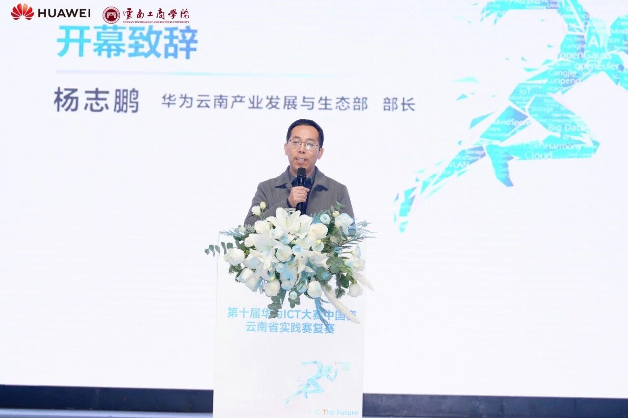 华为云南产业发展与生态部部长杨志鹏在开幕式发表致辞。他表示,华为 ICT 大赛作为全球 ICT 领域极具影响力的赛事品牌,是检验高校人才培养质量、衔接产业需求的重要标尺。他高度肯定云南工商学院人工智能学院在区域 ICT 教育创新发展中的引领作用与突出贡献,强调华为将以此次赛事为纽带,深化与学院的战略合作,通过技术赋能、资源共享、人才共育等方式,助力云南培养更多适应数字经济发展的技术精英与行业骨干,为产业转型升级提供人才支撑。