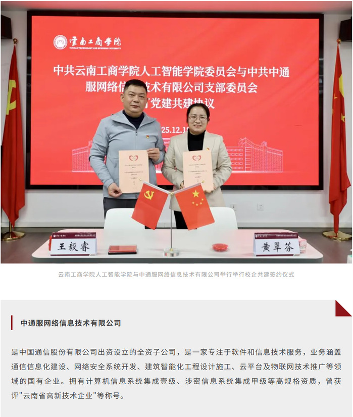 为深化产教融合、协同培育高素质应用型人才。近日,云南工商学院人工智能学院与中通服网络信息技术有限公司举行举行校企共建签约仪式,本次合作以党建为引领,旨在推动人才培养与产业需求精准对接,是学校深化产教融合、服务区域产业发展的又一重要举措,为人工智能领域高素质应用型人才培养构筑了更坚实的平台。中通服党支部书记、总经理王毅睿,云南工商学院人工智能学院党委书记黄翠芬、院长潘明波等出席会议。