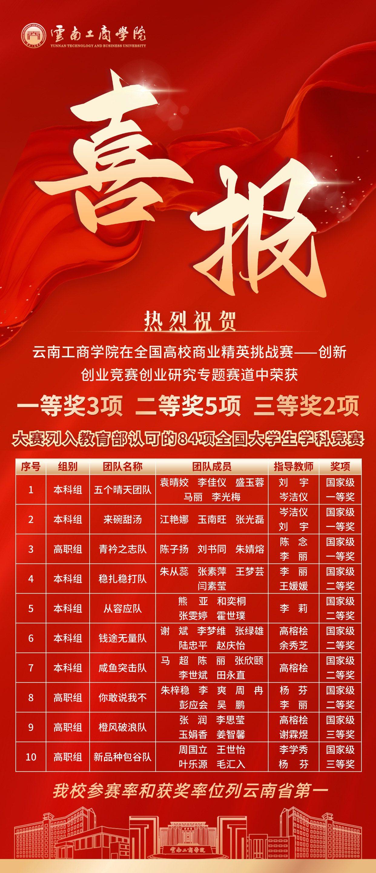 在全国高校商业精英挑战赛 —— 创新创业竞赛创业研究专题赛道中,云南工商学院审计学、会计学、工商管理等专业学子斩获国家级一等奖 3 项、二等奖 5 项、三等奖 2 项,共 10 项荣誉,我校参赛率与获奖率均位列云南省第一,有力彰显了我校商科教育的扎实成效。