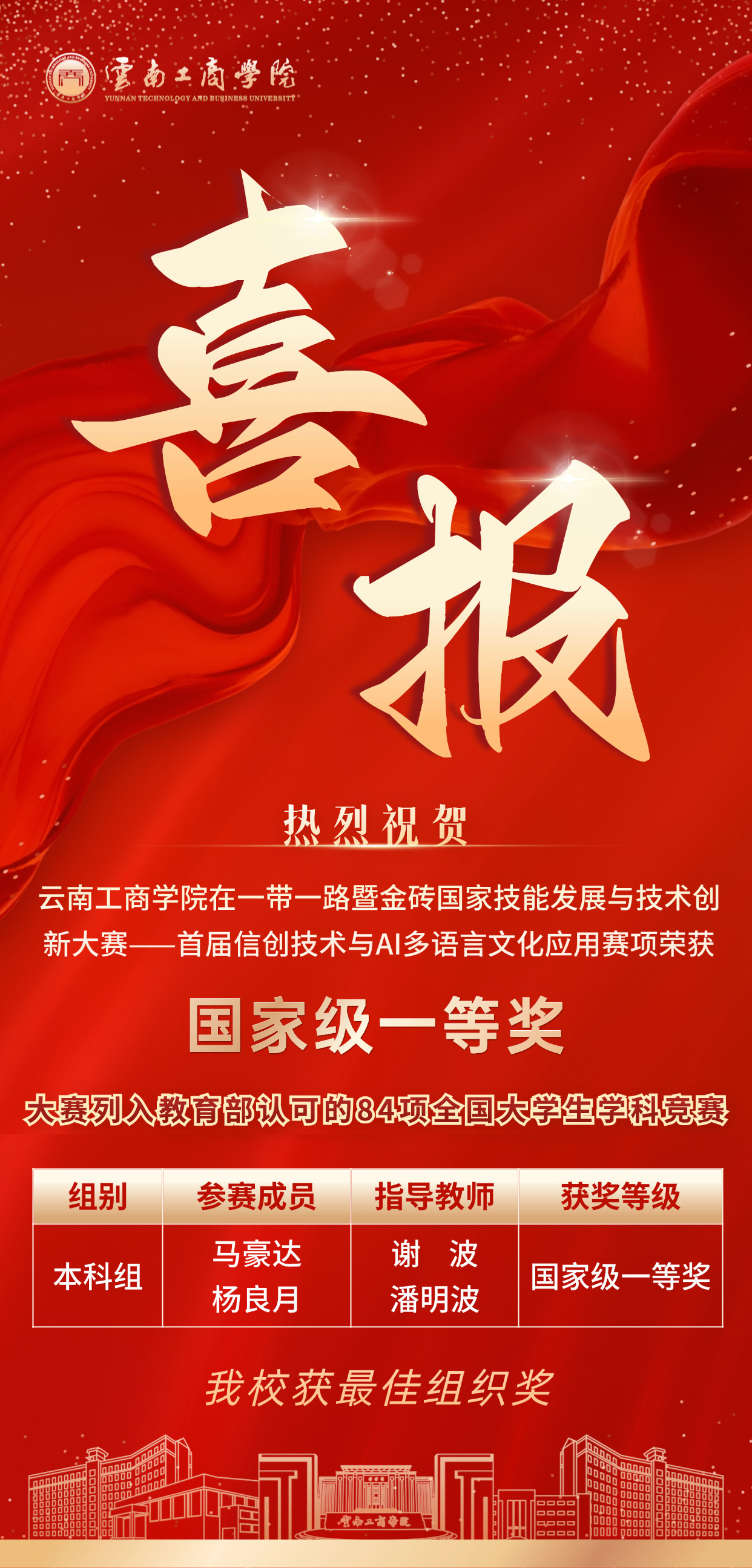 在一带一路暨金砖国家技能发展与技术创新大赛首届信创技术与 AI 多语言文化应用赛项中,云南工商学院计算机科学与技术专业学子凭借出色的专业能力斩获国家级一等奖,我校同时获评最佳组织奖,充分展现了学校在信创与 AI 多语言应用领域的育人实力与赛事组织水平。
