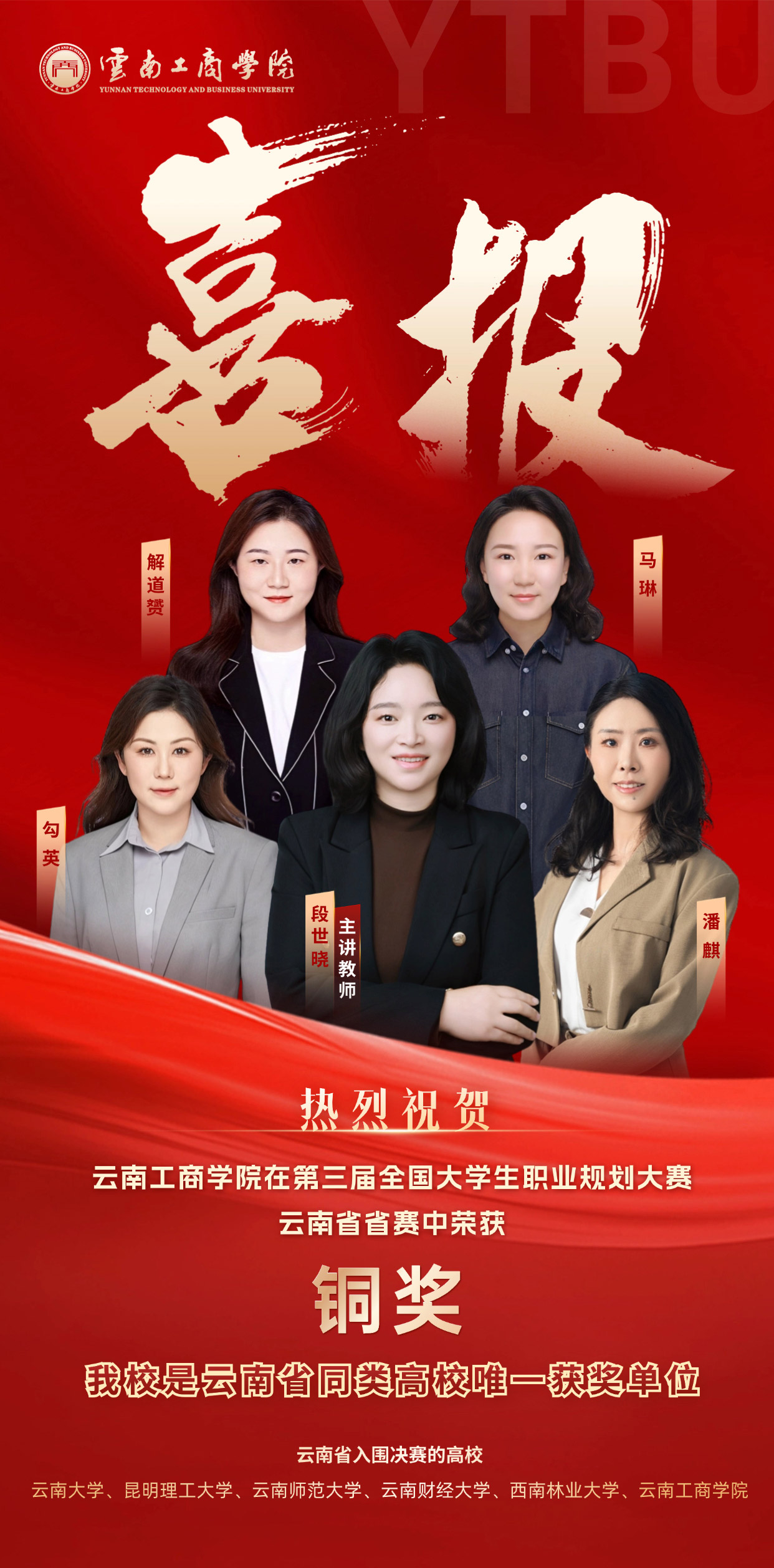 在第三届全国大学生职业规划大赛中,我校教师凭借扎实的教学功底与出色的课程设计脱颖而出,斩获铜奖,且我校是云南省同类高校中唯一获此殊荣的单位!这一佳绩充分彰显了我校在大学生职业发展与就业指导课程教学领域的过硬实力与育人成效!