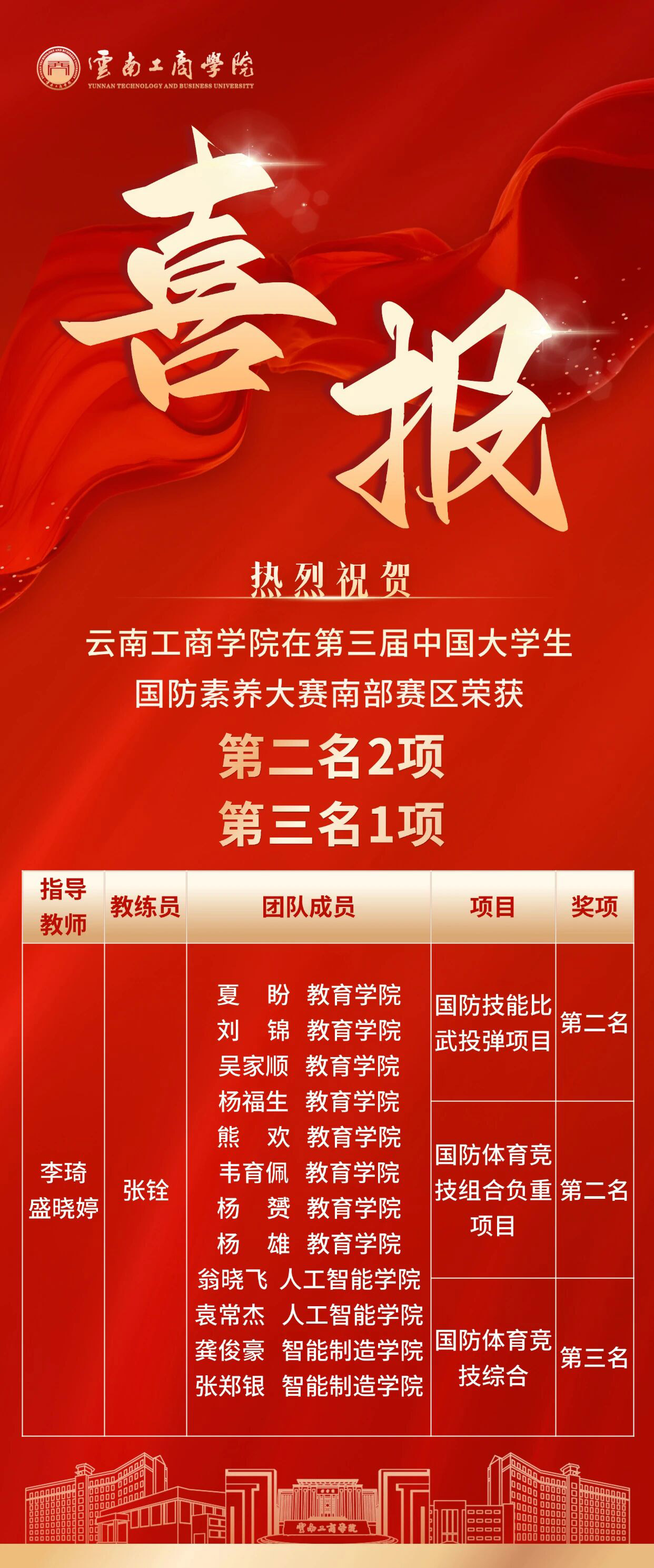 第三届中国大学生国防素养大赛南部赛区传来捷报!云南工商学院参赛学子凭借顽强的拼搏意志与扎实的技能储备,拿下 2 项第二名、1 项第三名,共 3 项奖项。