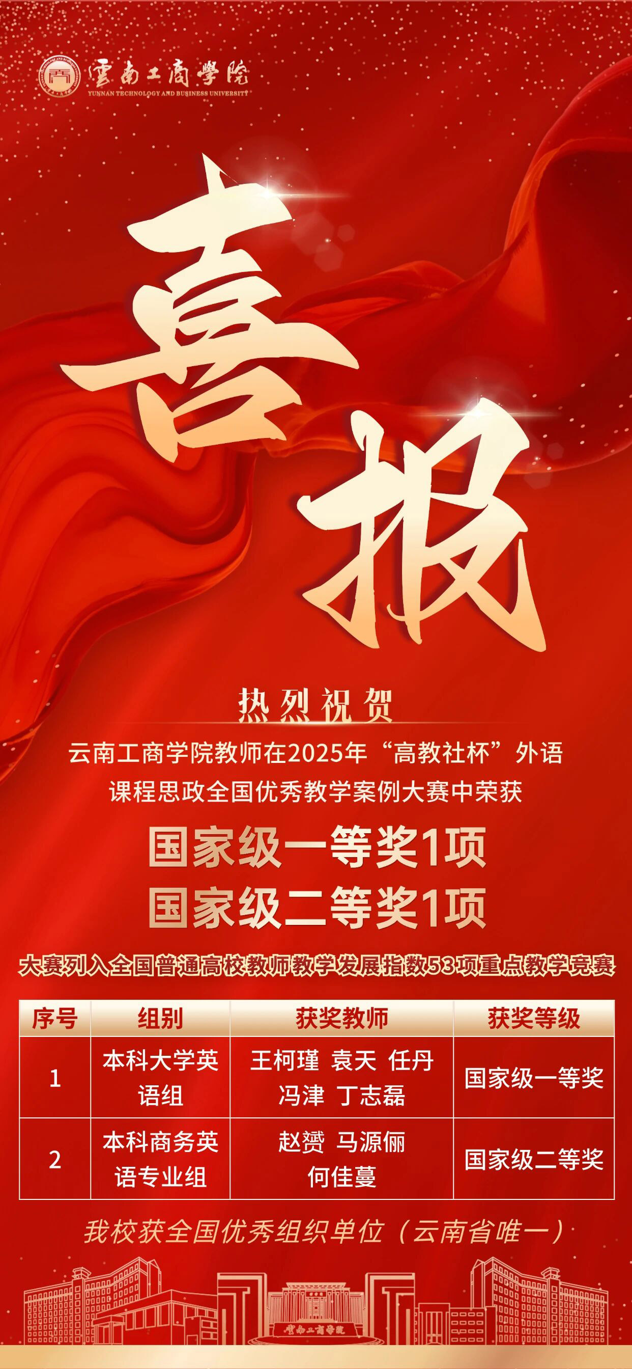 在2025年“高教社杯”外语课程思政全国优秀教学案例大赛中,云南工商学院教师凭借精湛的教学技艺、精准的思政切入点,成功斩获国家级一等奖1项、国家级二等奖1项。我校亦凭借完善的赛事保障与卓越的组织能力,成为云南省唯一获评全国优秀组织单位的院校,全方位展现了云工商在高校外语教学领域的过硬实力与育人担当!
