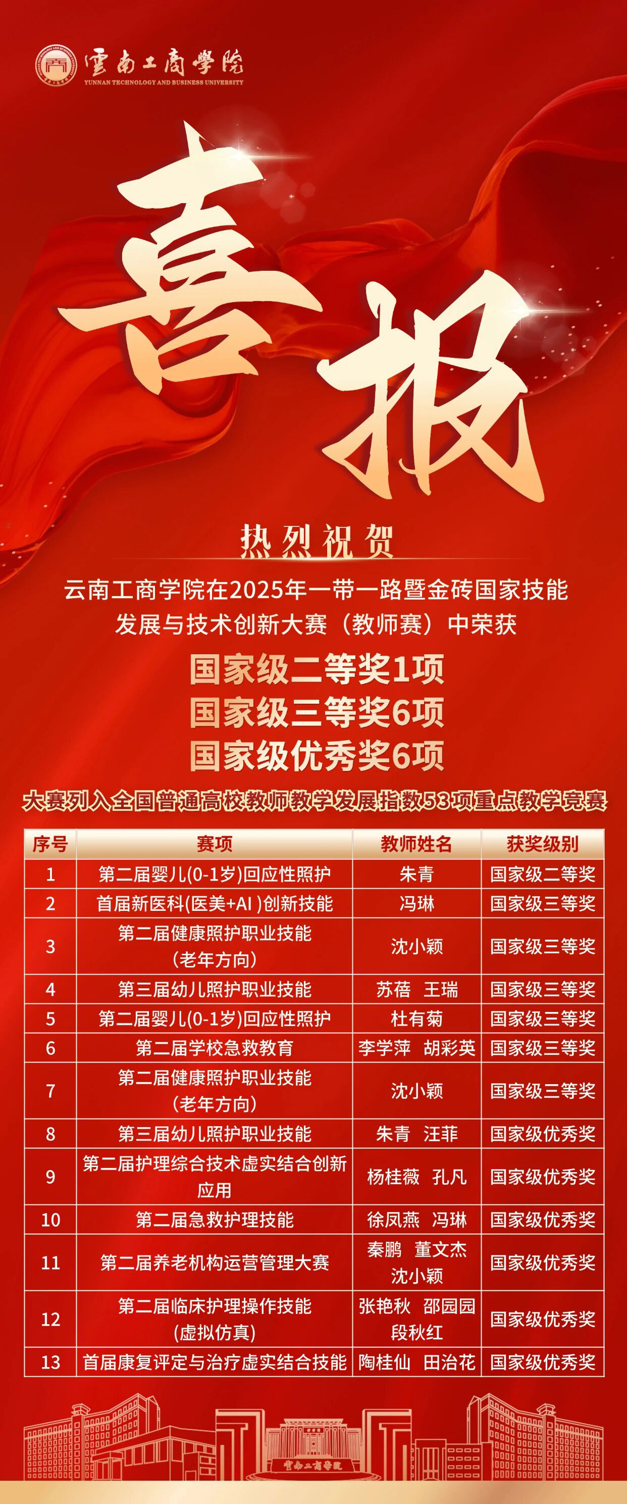 在2025年一带一路暨金砖国家技能发展与技术创新大赛(教师赛)中,云南工商学院教师凝心聚力、奋勇拼搏,成功揽获13项国家级奖项,涵盖二等奖1项、三等奖6项及优秀奖6项。
