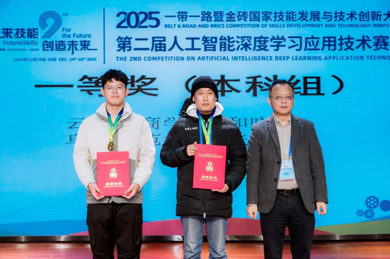 在一带一路暨金砖国家技能发展与技术创新大赛人工智能深度学习应用技术赛项中,云南工商学院计算机科学与技术、软件工程专业学子凭借扎实的专业能力斩获国家级一等奖 1 项、二等奖 1 项,我校同时获评最佳组织奖,有力印证了我校在人工智能人才培养与赛事组织方面的双重优势。