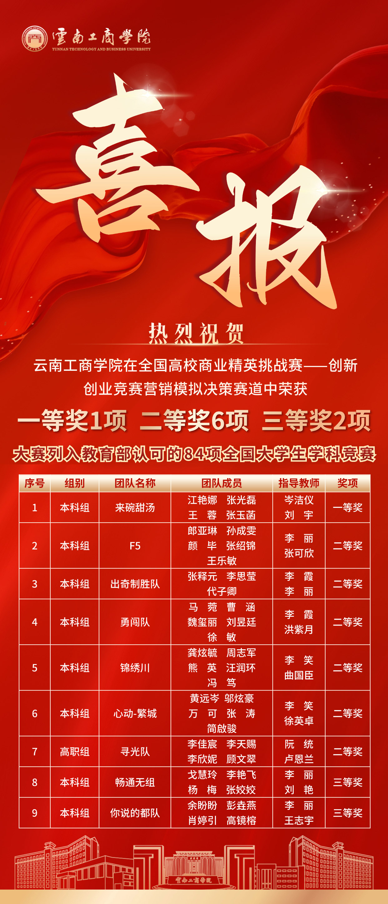 在全国高校商业精英挑战赛 —— 创新创业竞赛营销模拟决策赛道中,云南工商学院审计学、会计学、工商管理等专业学子奋勇争先,一举斩获 9 项大奖,包括一等奖 1 项、二等奖 6 项、三等奖 2 项。