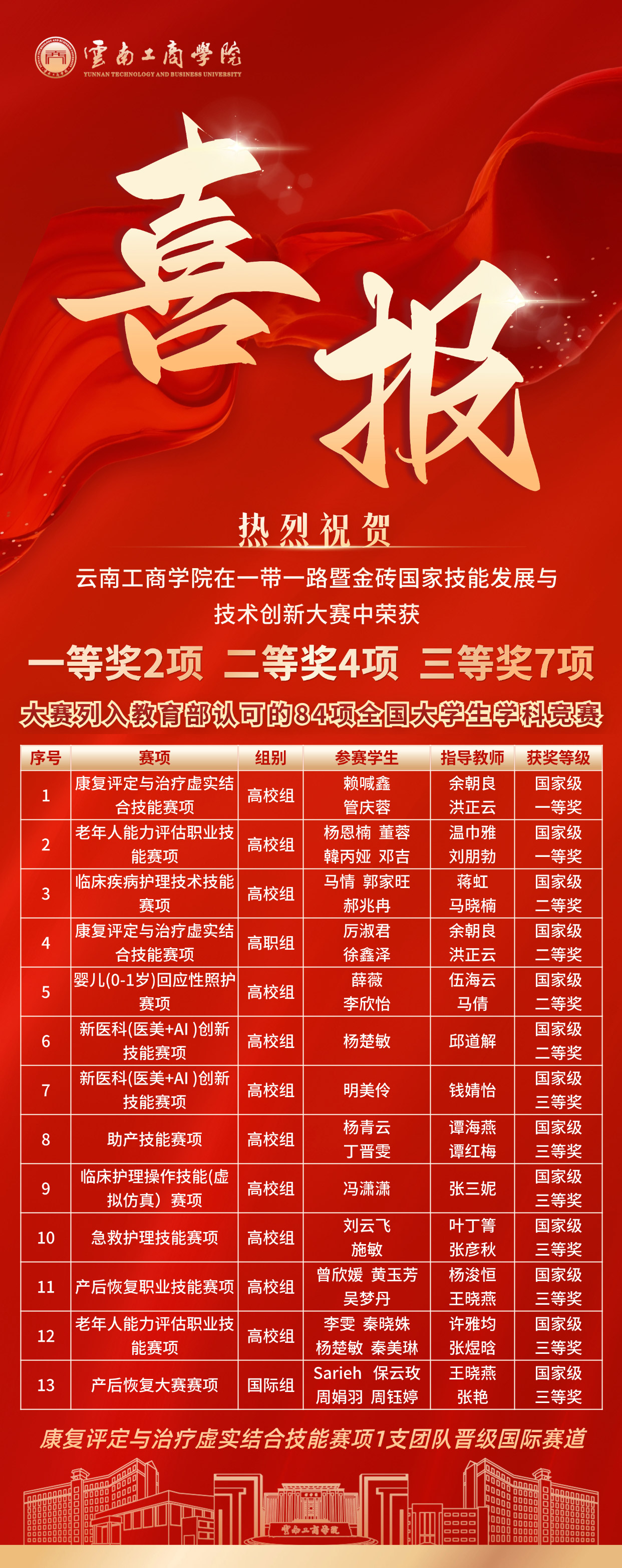 在一带一路暨金砖国家技能发展与技术创新大赛中,云南工商学院护理学专业学子表现卓越,一举斩获 13 项国家级奖项,包括:一等奖 2 项、二等奖 4 项、三等奖 7 项。其中,康复评定与治疗虚实结合技能赛项团队成功晋级国际赛道。