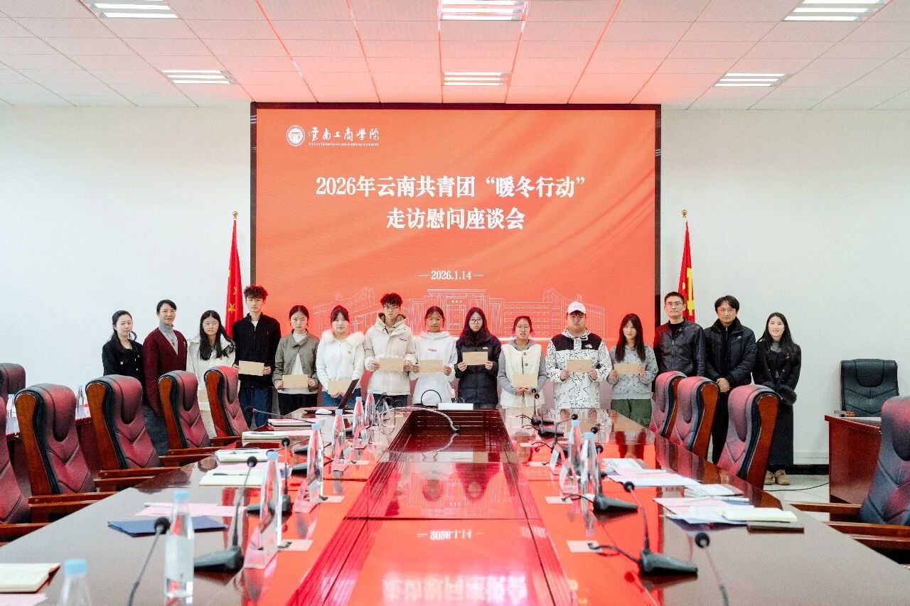 为深入贯彻落实共青团中央服务青年工作部署,持续推动“暖冬行动”走深走实,近日,云南共青团“暖冬行动”走访慰问座谈会在云南工商学院举行。共青团云南省委副书记魏同涛、少年部副部长赵彪,云南工商学院党委书记李国琼、校团委书记盛晓婷,各学院团总支负责人及学生代表参会,共话青年成长,共商团学发展。