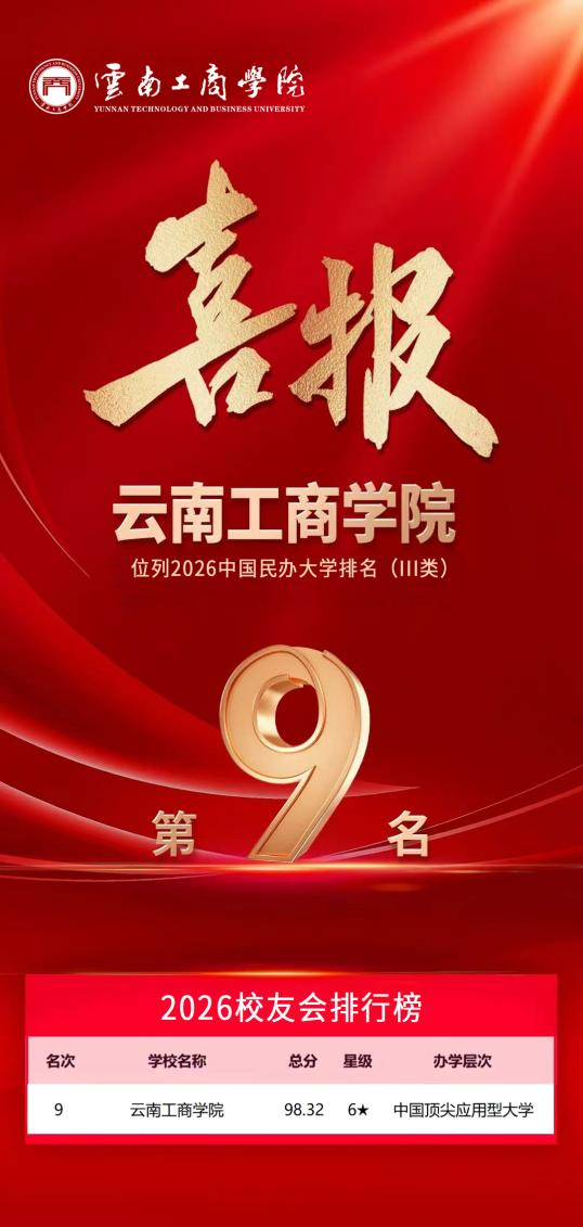 1月12日,全国第三方大学评价机构艾瑞深校友会网(Cuaa.net)正式发布《2026中国大学排名》,云南工商学院以98.32分位列中国民办大学排名(III类)第9名,被评定为6星级中国顶尖应用型大学,稳居全国同类高校第一方阵。