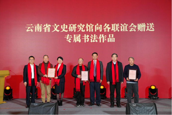 云南省文史研究馆向三个联谊会赠送了凝聚深意的专属墨宝,其内容分别对应三个联谊会的核心使命与殷切期许,以笔墨承载文脉,以丹青凝聚同心。