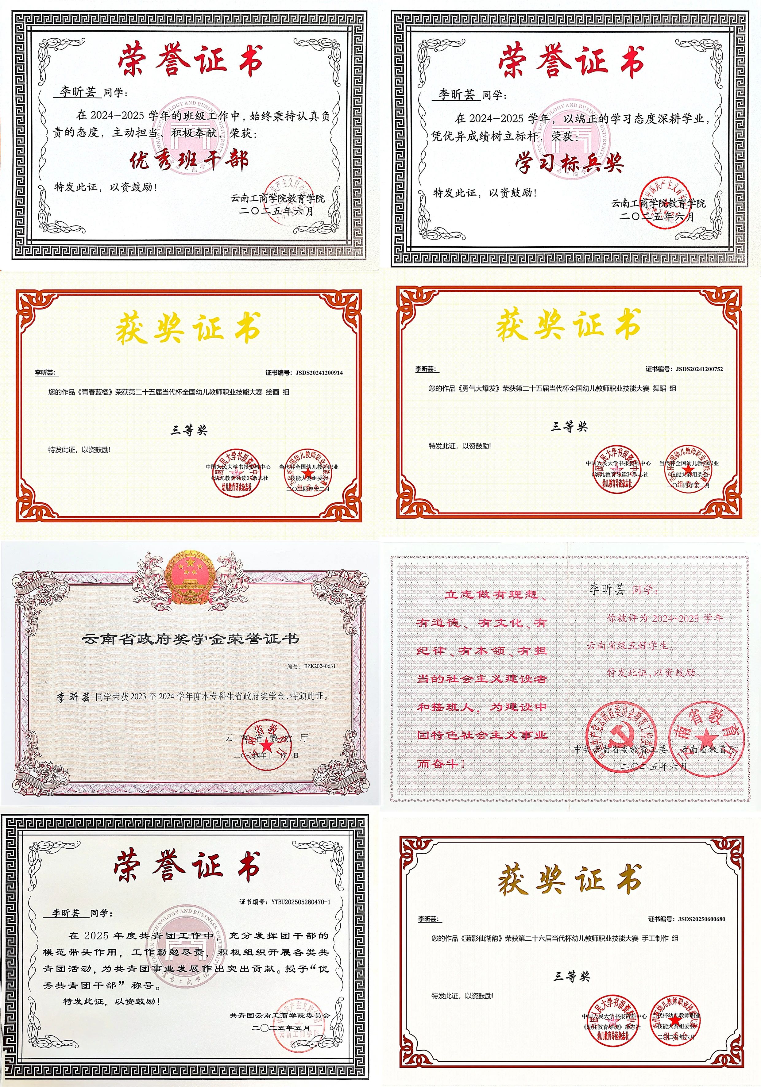李昕芸同时斩获国家奖学金、云南省政府奖学金,获评省级五好学生,在当代杯幼儿教师技能大赛中拿下手工、绘画、舞蹈组多项三等奖,从懵懂学子蜕变为兼具专业与爱心的准教育工作者。