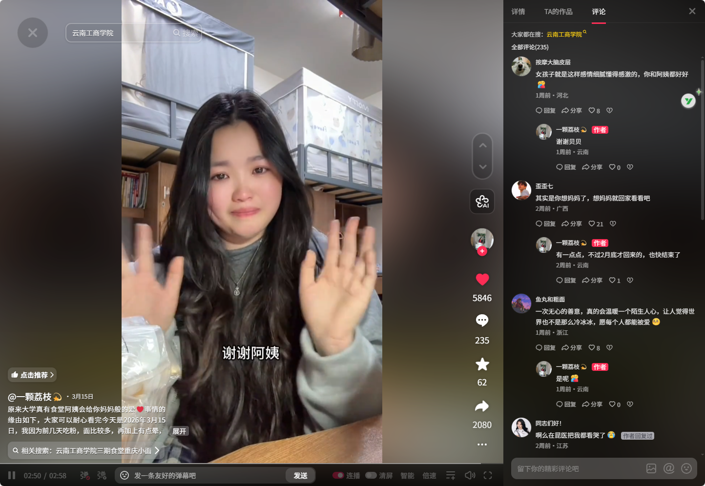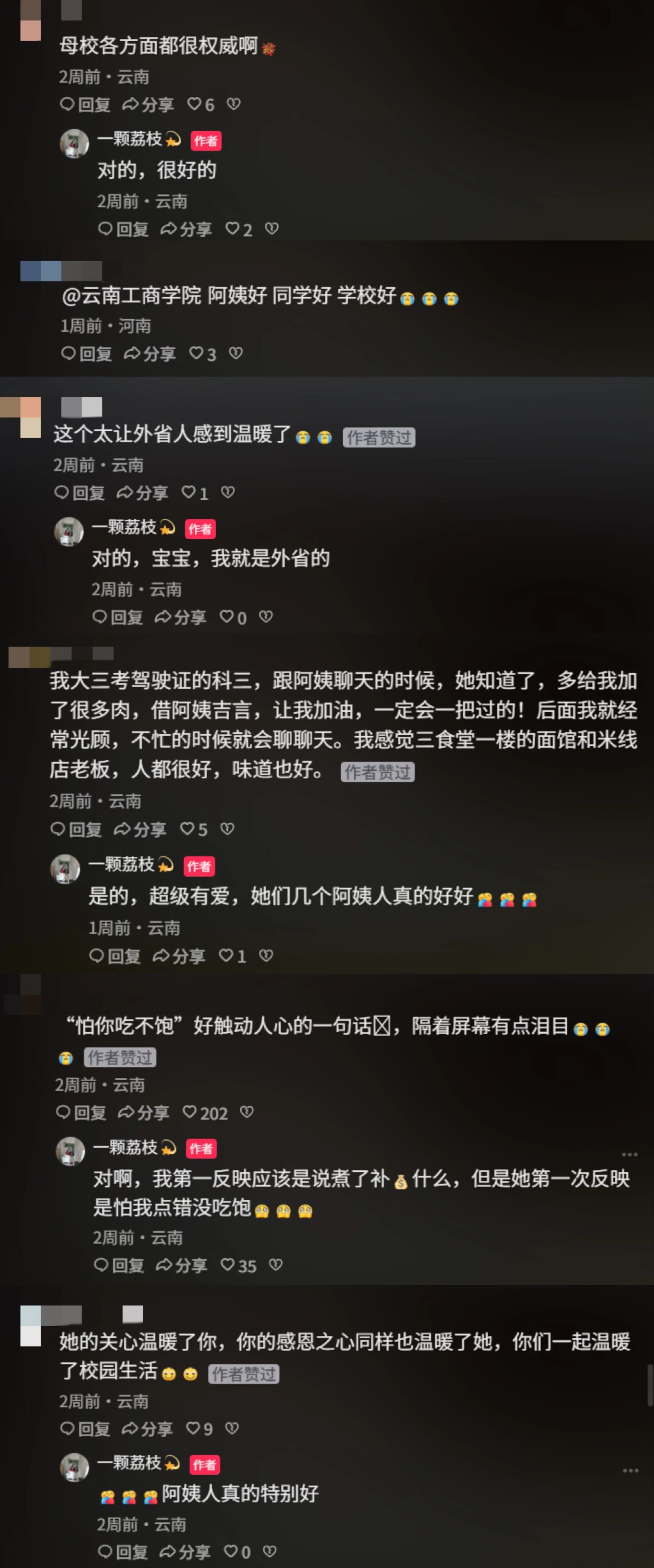 这份朴素的善意,被同学用镜头记录下来,发布在抖音后迅速引发共鸣。有人说 “母校各方面都很权威”,有人被这份温暖戳中 “太让外省人感到温暖了”,还有同学分享着食堂阿姨们日常的温柔 —— 考科三时阿姨多给的肉、食堂阿姨笑呵呵的叮嘱、“怕你吃不饱” 的贴心……还有人写下这样一段话:“她的关心温暖了你,你的感恩之心同样也温暖了她,你们一起温暖了校园生活。”