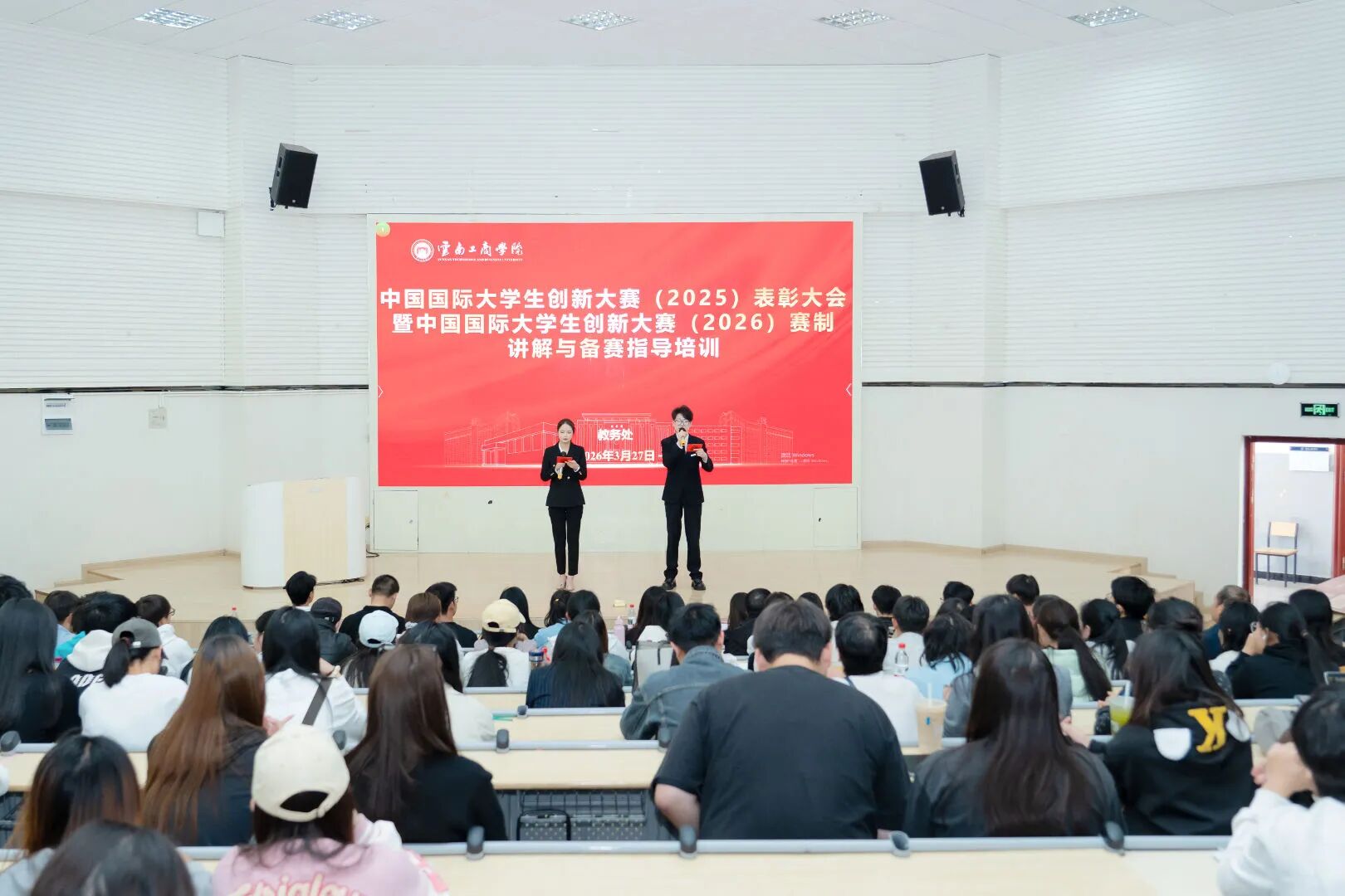 近日,云南工商学院隆重举行中国国际大学生创新大赛(2025)表彰大会暨中国国际大学生创新大赛(2026)赛制讲解与备赛指导培训。校长助理张健、教务处处长周丽萍出席大会,中国国际大学生创新大赛国赛评委铁婧受邀作专题指导,2025年度国家级获奖团队、各学院师生代表及参赛团队齐聚一堂,共同见证荣耀时刻,启航新征程。