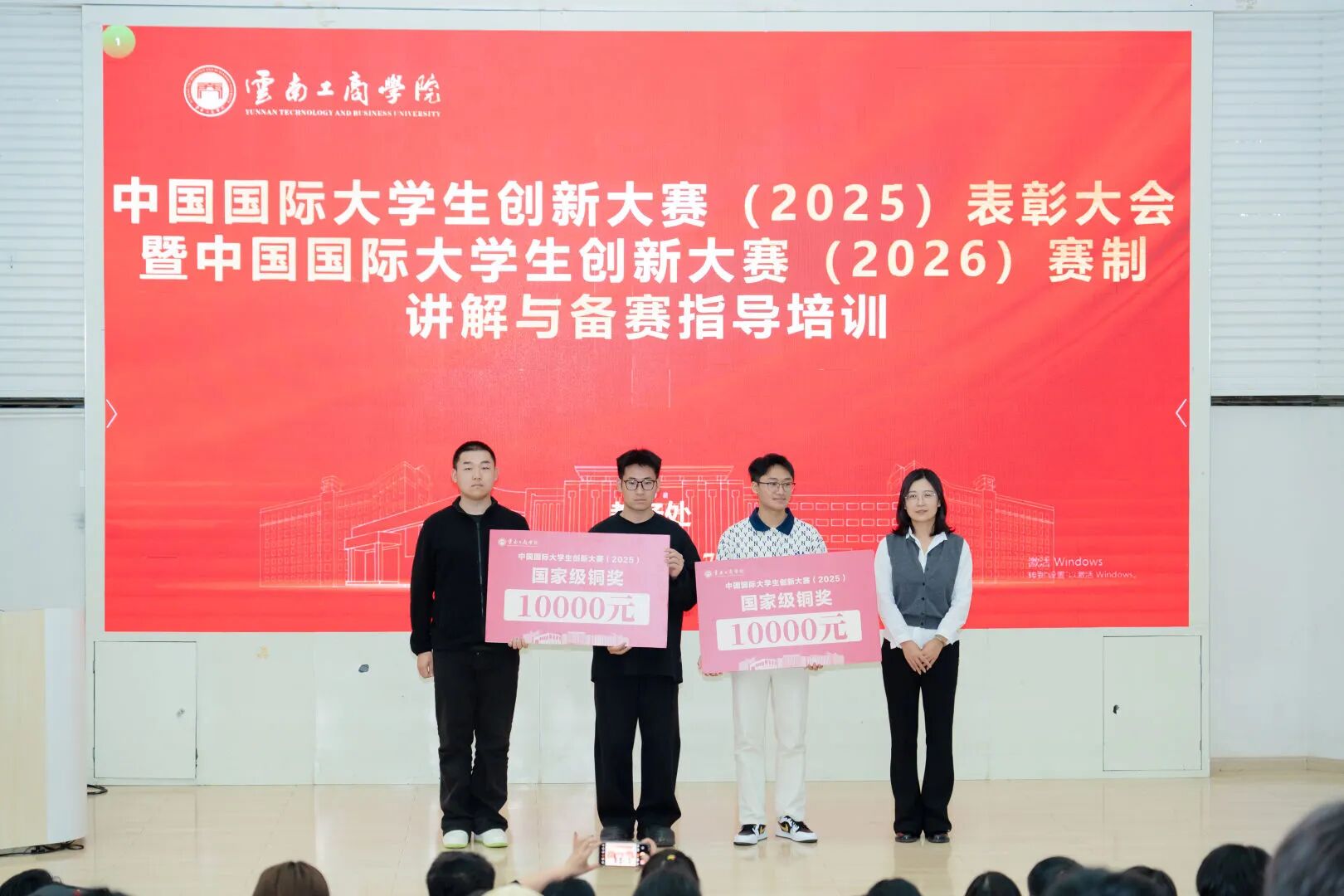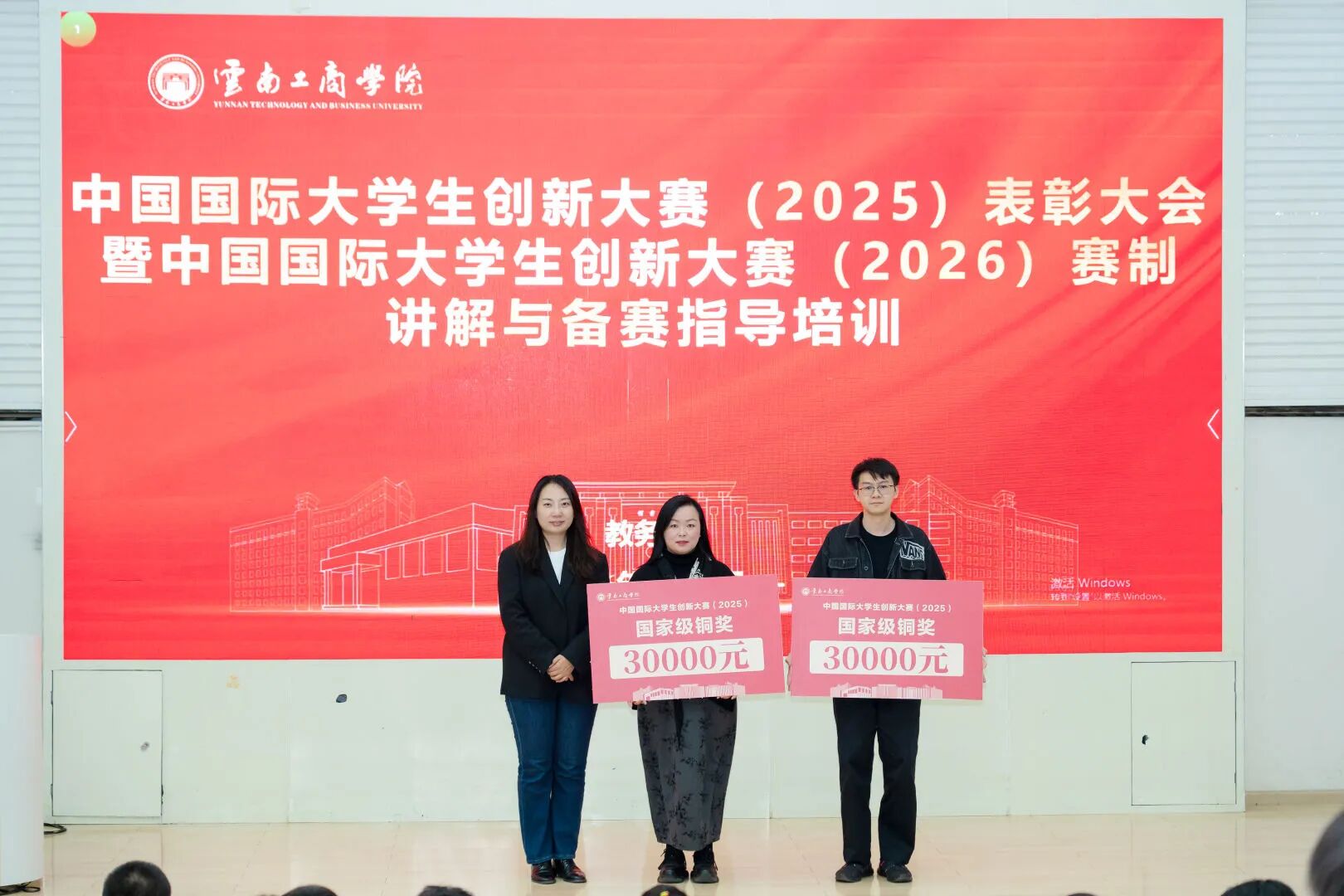 颁奖环节,校长助理张健、教务处处长周丽萍分别为中国国际大学生创新大赛(2025)国家级铜奖项目指导教师及学生团队颁发荣誉。本届大赛中,云南工商学院共斩获2项国家级铜奖,指导教师团队获30000元/项奖励,学生团队获10000元/项奖励。