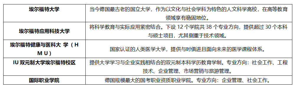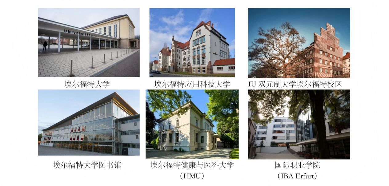 埃尔福特市拥有 5 所高校,共有约 12000 名来自 50 个国家的留学生,含南亚与东南亚地区。