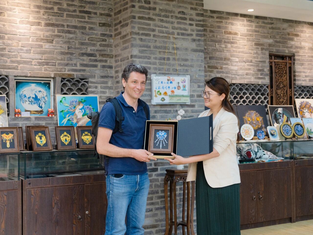 在非遗文化传承工作室,云南工商学院国际学院院长杨扬代表学校向 Thomas Mailart 先生赠送由我校师生亲手制作的翠羽银丝手工艺品。走访期间,学校师生与参访团就产教融合、创新创业、非遗文化传承、学生社区建设等领域的创新探索与实践成效进行了细致交流。